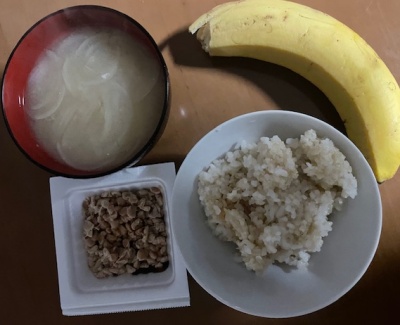 発芽玄米ご飯40g、ひきわり納豆、味噌汁、バナナ2本、まるごとバナナ