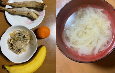 かぼちゃ、バナナ、ぷりん、味噌汁(卵、玉葱)