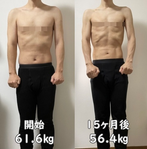 16時間ダイエット開始から15ヶ月間の体重の変化は、61.6㎏→56.4㎏でマイナス5.2キロです。