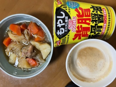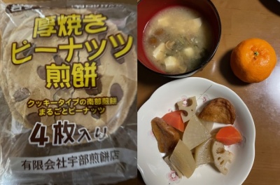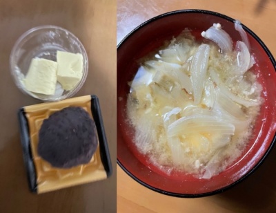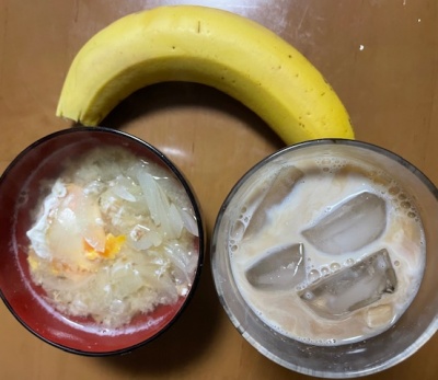 バナナ2本、味噌汁(玉ねぎ、卵)、ビスコ、アイス豆乳ラテ