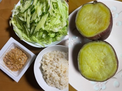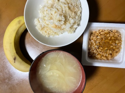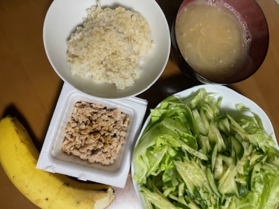 発芽玄米ご飯40g、ひきわり納豆、味噌汁(玉葱)、サラダ(きゅうり、レタス)、バナナ
