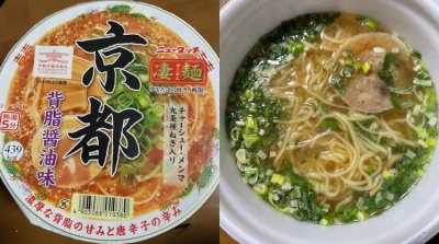 発芽玄米ご飯40g、ひきわり納豆、サラダ(レタス、きゅうり)、バナナ、味噌汁(玉ねぎ)、カップ麺