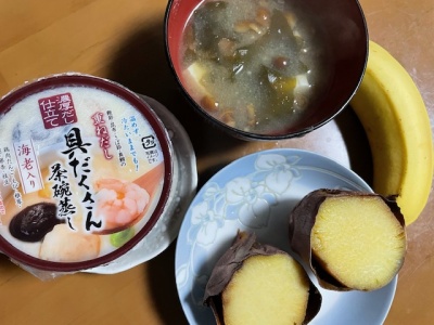 焼き芋、味噌汁(なめこ、豆腐、わかめ)、茶碗蒸し、バナナ