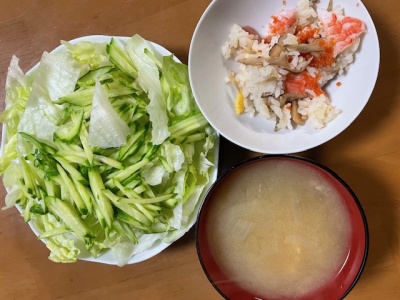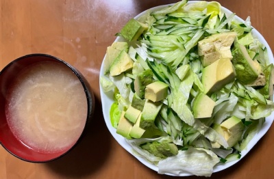 サラダ(レタス、アボカド、きゅうり)、味噌汁(玉葱)