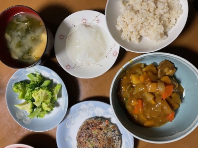 発芽玄米ご飯40g、ひきわり納豆、鍋(白菜、鶏つくね、えのき茸)、味噌汁(玉ねぎ)、切り干し大根