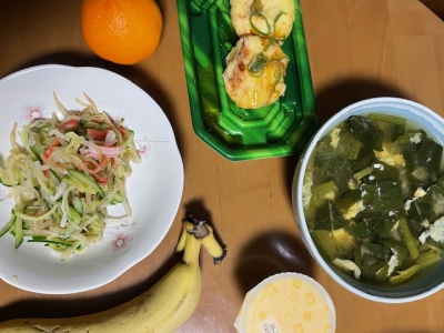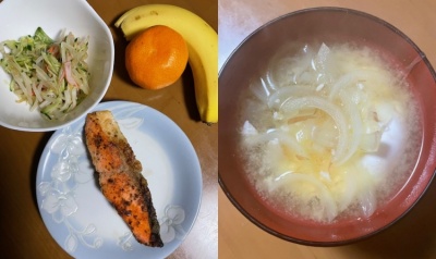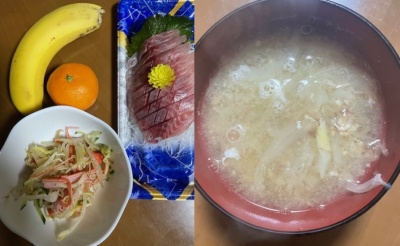 バナナ、みかん、刺身、もやしのサラダ、味噌汁(玉葱、卵)