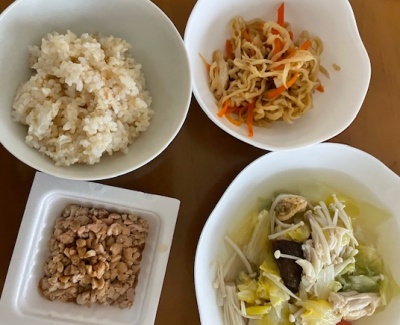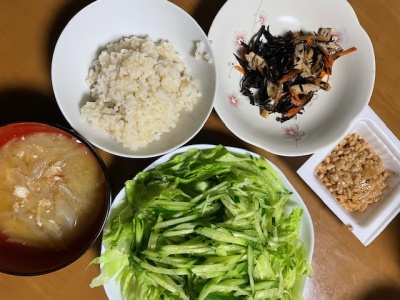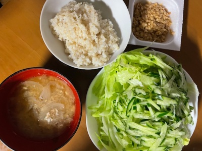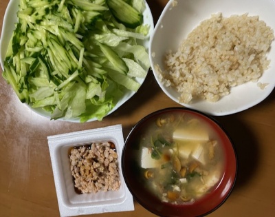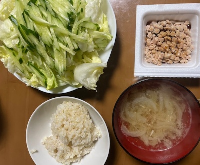発芽玄米ご飯40g、ひきわり納豆、味噌汁(玉葱)、サラダ(レタス、きゅうり)
