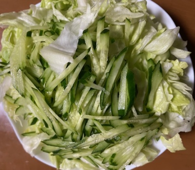 サラダ(レタス、きゅうり)、バナナ、みかん