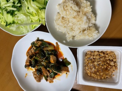 発芽玄米ご飯、ひきわり納豆、サラダ(レタス、きゅうり)