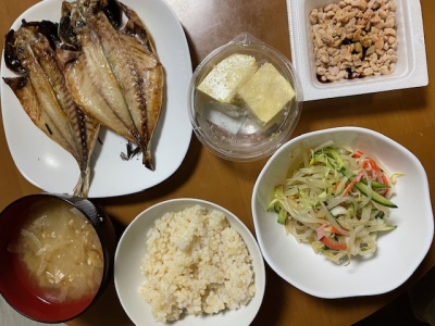 発芽玄米ご飯45g、ひきわり納豆、鯵の開き、味噌汁(玉ねぎ)、もやしのサラダ、プリン