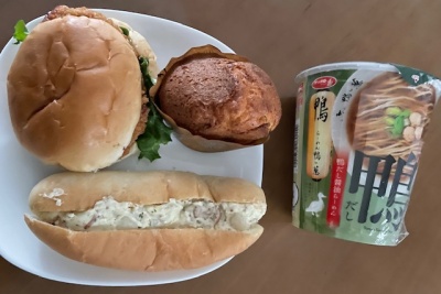 ささみカツパン、あんぱん、マフィン、コロッケパン、ポテトサラダパン、カップ麺、ホットカフェラテM、豚汁