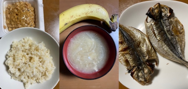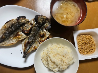 発芽玄米ご飯、ひきわり納豆、鯵の開き、味噌汁、ミルク飴