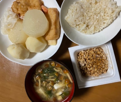 発芽玄米40g、ひきわり納豆、切り干し大根、鍋(白菜、鶏肉、えのき、ホタテ)