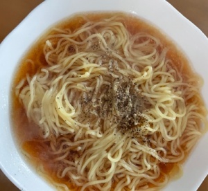 発芽玄米ご飯、ラーメン、タラ、キャベツ、味噌汁、煮物、バナナ、みかん