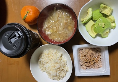 発芽玄米ご飯40g、ひきわり納豆、味噌汁(玉ねぎ)、アボカド、みかん、ホットカフェラテL