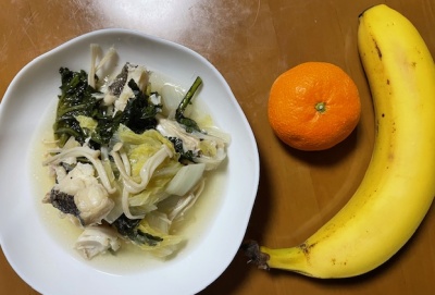 みかん、バナナ、鍋(白菜、春菊、鱈、えのき)、アイス豆乳ラテ、味噌汁(玉葱)