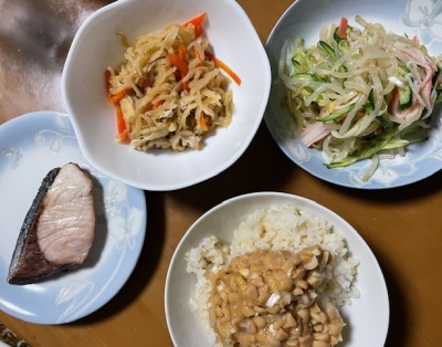 発芽玄米ご飯40g、ひきわり納豆、切り干し大根、もやしのサラダ、ブリの塩焼き