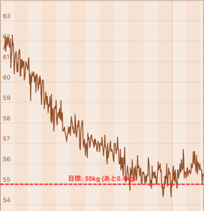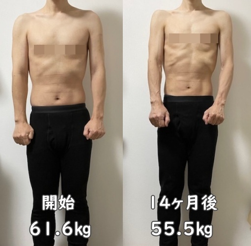 16時間ダイエット開始から14ヶ月間の体重の変化は、61.6㎏→55.5㎏でマイナス6.1キロです。