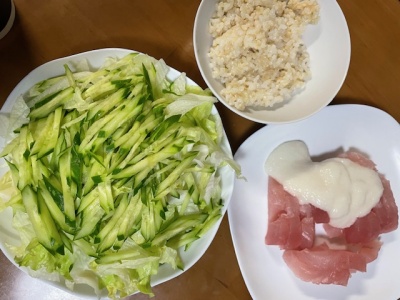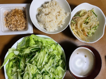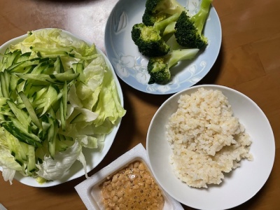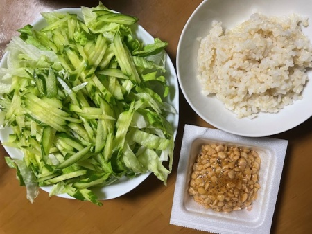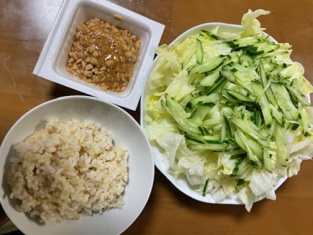 発芽玄米ご飯40g、ひきわり納豆、サラダ(レタス、きゅうり)、バナナ