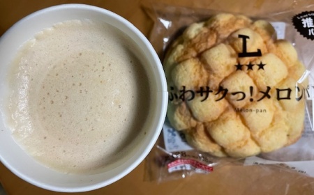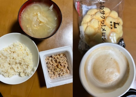 発芽玄米ご飯40g、ひきわり納豆、味噌汁(玉ねぎ)、メロンパン、ホットカフェラテL