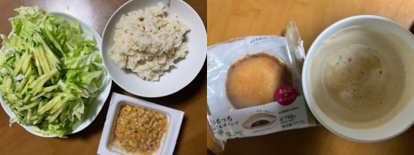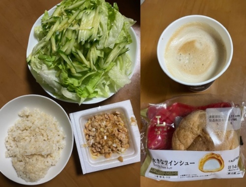 発芽玄米ご飯45g、ひきわり納豆、サラダ(レタス、きゅうり)、シュークリーム、ホットカフェラテL