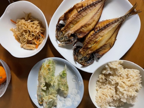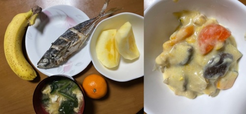 アジの塩焼き、りんご、バナナ、みかん、味噌汁(たまご、ほうれん草)、シチュー