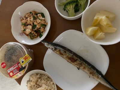 発芽玄米ご飯、秋刀魚の塩焼き、味噌汁、麻婆豆腐、麻辣湯、りんご、バナナ、ブロッコリー、チョコ、飴