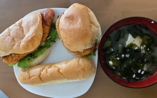 ホットカフェラテL、コロッケパン、鶏ささみ揚げパン、たまごパン、味噌汁