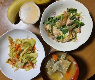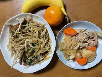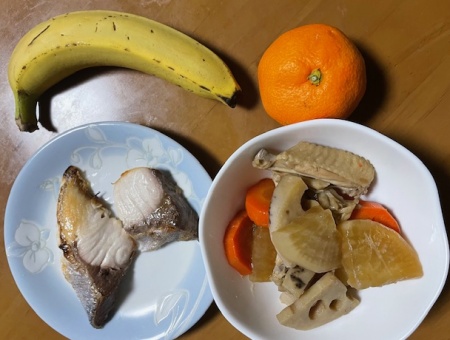 バナナ2本、みかん、ぶり、煮物(大根、人参、蓮根、手羽先)、味噌汁(玉ねぎ、卵)、アイス豆乳ラテ