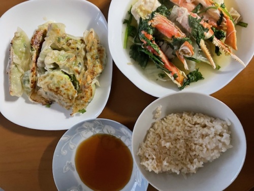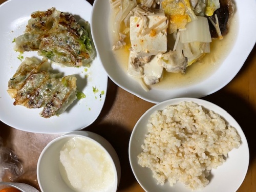 発芽玄米ご飯、餃子、鍋、バナナ、みかん、ホットカフェラテL