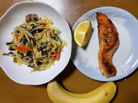鮭、野菜炒め、バナナ2本、ホットカフェラテL