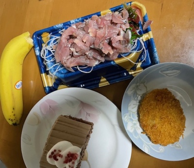 バナナ、ホットカフェラテL、アジの刺身、ケーキ