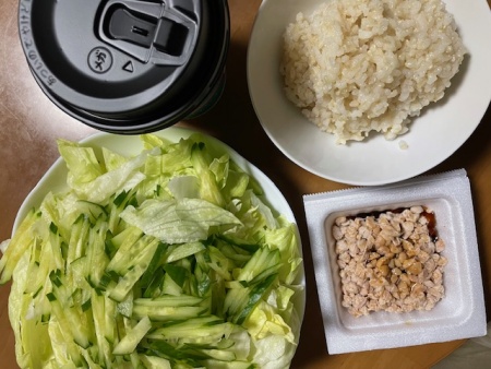 発芽玄米ご飯45g、ひきわり納豆、サラダ(レタス、きゅうり)、アイス豆乳ラテ