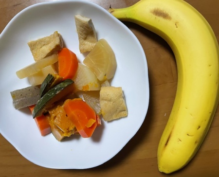 バナナ2本、煮物(大根、人参、厚揚げ)、ミルク飴3個、ホット豆乳ラテ