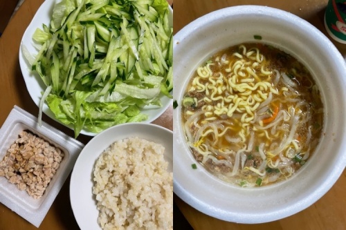 発芽玄米ご飯40g、サラダ(レタス、きゅうり)、カップ麺