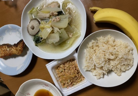 発芽玄米ご飯45g、ひきわり納豆、鍋(白菜、春菊、えのき、椎茸)、バナナ、魚、酵素ドリンク、アイス豆乳ラテ