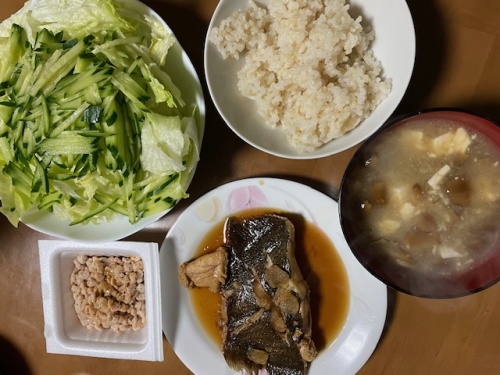 発芽玄米ご飯40g、ひきわり納豆、味噌汁(なめこ、豆腐)、カレイ、サラダ(レタス、きゅうり)、みかん