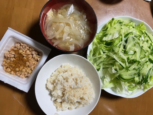 発芽玄米ご飯40g、ひきわり納豆、味噌汁(玉ねぎ)、サラダ(レタス、きゅうり)、アイス豆乳ラテ
