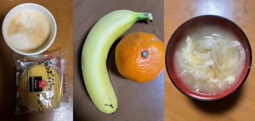 ホットカフェラッテL、ジャンボ蒸しパン、みかん、バナナ、味噌汁(卵、玉ねぎ)