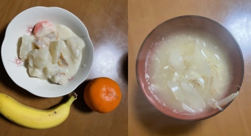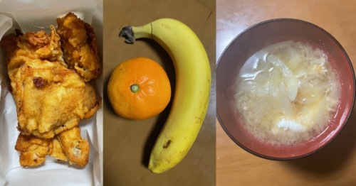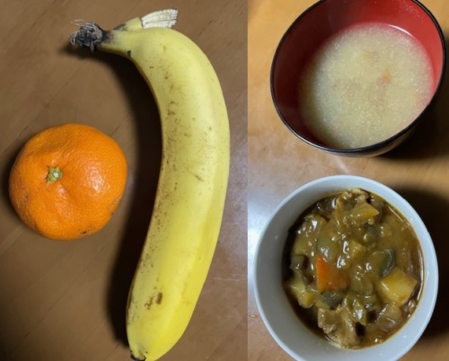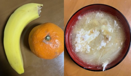 バナナ、みかん、味噌汁(玉葱、卵)、黒飴2個