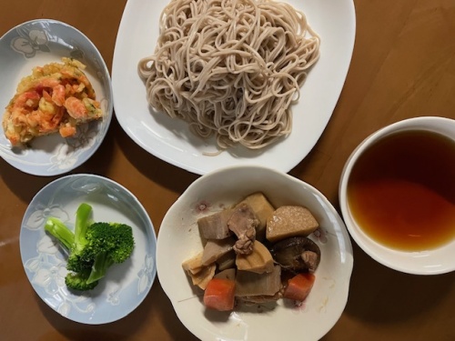 発芽玄米ご飯30g、ひきわり納豆、蕎麦、煮物、天ぷら、ブロッコリー、みかん2個、バナナ