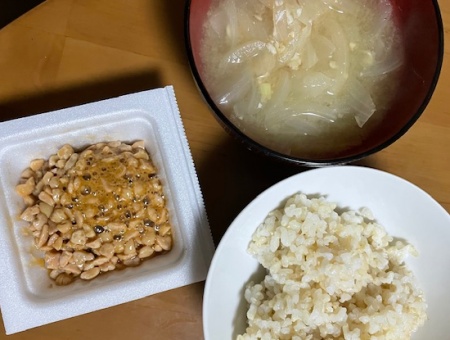 発芽玄米ご飯45g、ひきわり納豆、味噌汁(玉ねぎ)、バナナ、アイス豆乳ラテ、酵素ドリンク