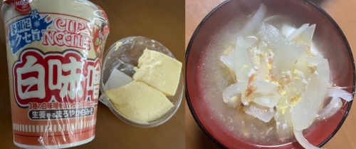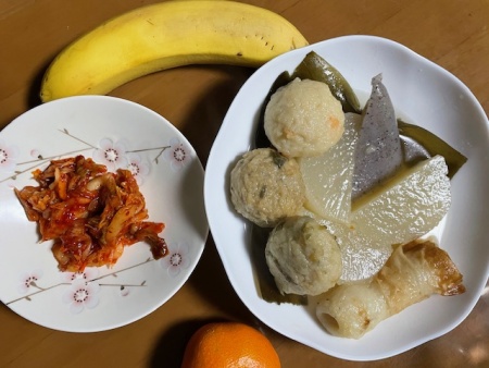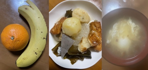みかん、バナナ、おでん、味噌汁(なめこ、卵)、アイス豆乳ラテ