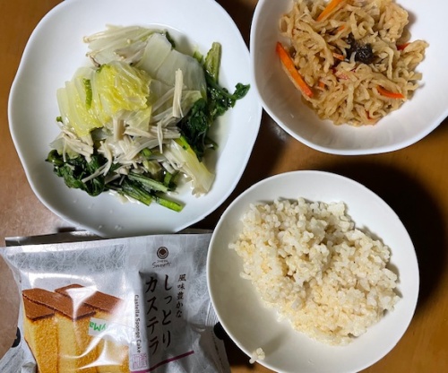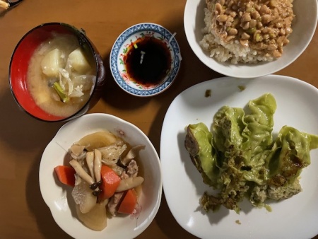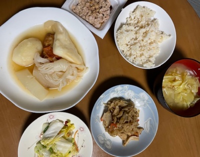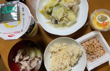 発芽玄米ご飯40g、ひきわり納豆、鍋(白菜、えのき)、豚汁、カップ麺、プリン