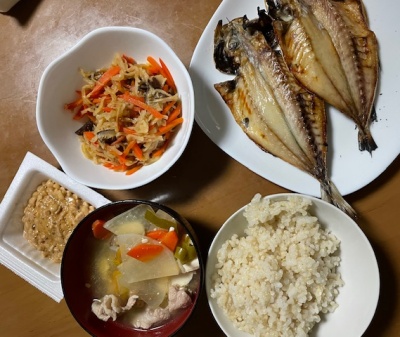 発芽玄米ご飯50g、アジの開き、ひきわり納豆、切り干し大根、バナナ、みかん、豚汁3杯