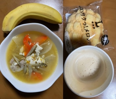 豚汁、バナナ、メロンパン、ホットカフェラテM