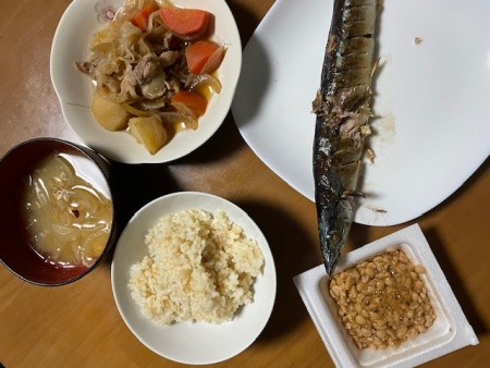 発芽玄米ご飯、ひきわり納豆、さんま、味噌汁、肉じゃが、アイス豆乳ラテ、酵素ドリンク
