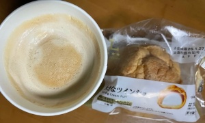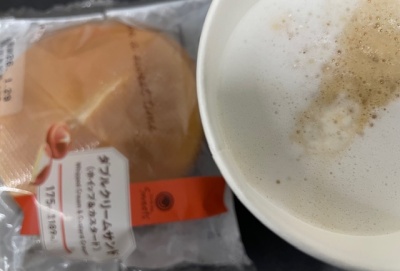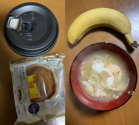 ホットカフェラテL、どら焼き、バナナ、味噌汁(玉ねぎ、卵)