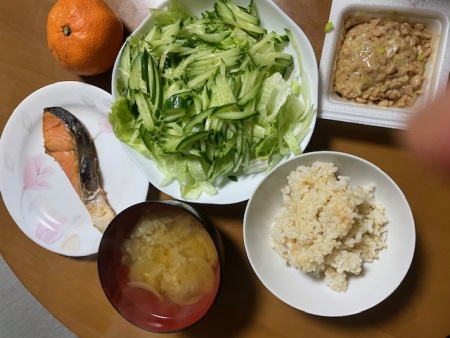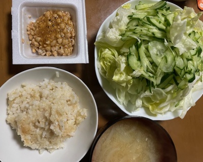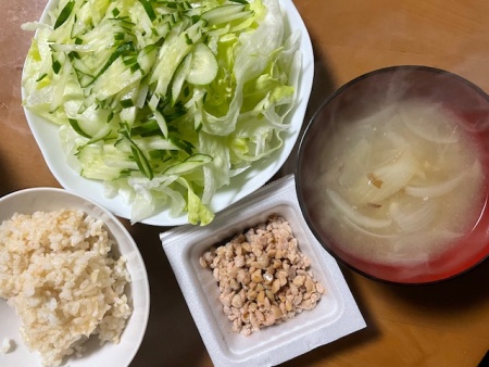 発芽玄米ご飯50g、ひきわり納豆、味噌汁(玉ねぎ)、サラダ(レタス、きゅうり)
