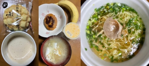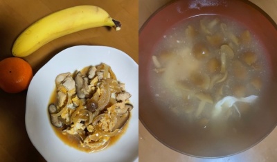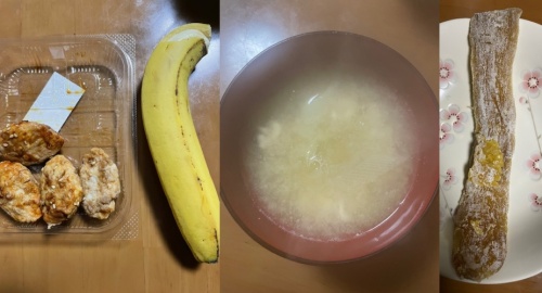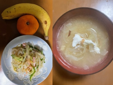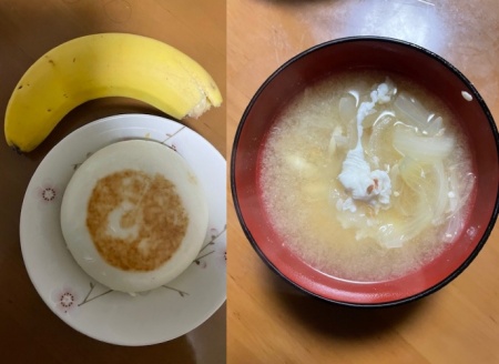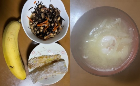 焼き芋、バナナ、みかん、味噌汁(玉ねぎ、卵)